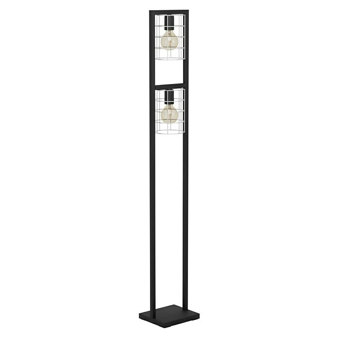 De vloerlamp JUBILY bestaat uit een rechthoekige lampvoet en een solide frame van zwart metaal. Het element is in het bovenste gedeelte gecombineerd met twee.