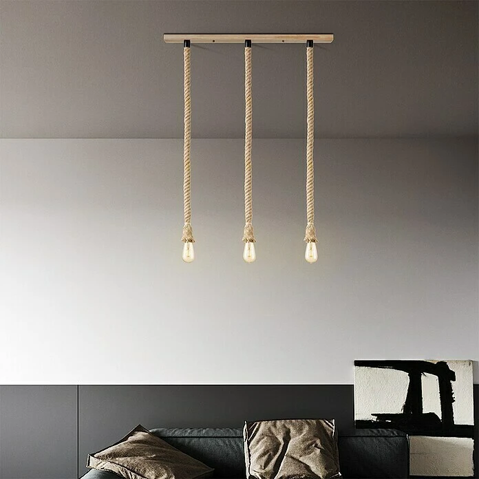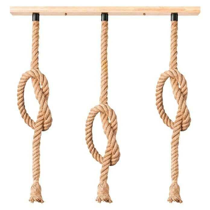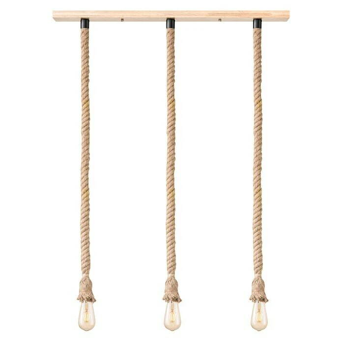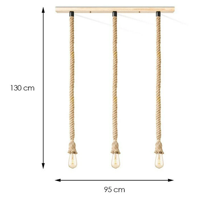 Deze 3-lichts touw hanglamp Leonardo van home sweet home is een stoere pendel hanglamp met 3 robuuste gedraaide touwen als pendels waarbij de natural look ervan afspat! De touwlamp van hout en scheepstouw Leonardo is tot max. 130 cm in hoogte verstelbaar en is ideaal boven een aanrecht, bar, eettafel of sidetable. Ook mogelijk: laat je creativiteit zien en leg heel speels een knoop in elk touw, waarbij de lampjes op verschillende hoogtes hangen. Levering exclusief lichtbronnen, passend voor een E27 lichtbronnen van max. 40 watt. De naturel houten plafondbalk is 95 cm breed.