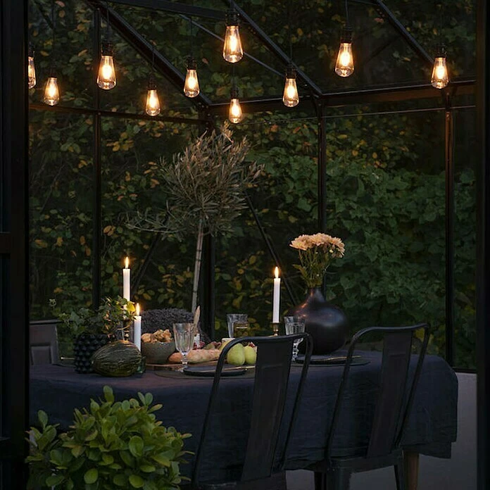 Maak het hele jaar door een geslaagd feestje van alle (buiten) activiteiten met dit stijlvolle en sfeervolle koppelbare feestverlichtingsnoer met 4 traps dimmer van het Zweedse premium merk Konstsmide. Dit 10 lamps en 10m lange Power LED lichtsnoer heeft UV bestendige Edison acryl bollen en een prachtige en krachtige extra warmwitte sfeervolle lichtkleur. Dit startsnoer van 10m lengte kan worden verlengd met nog eens maximaal 3x add-on snoeren van 10m lengte van het type 2352-800 tot maximaal 40m verlichte snoerlengte. De krachtige maar sfeervolle PowerLED lichtbronnen zijn energiezuinig maar toch krachtig en duurzaam. Mocht er een lichtbron uitvallen dan vervang je deze zeer eenvoudig. Het snoer is bestand tegen extreme Scandinavische weersomstandigheden en doorstaat moeiteloos hoge en lage temperaturen. De Edison bollen zijn zeer goed geïsoleerd tegen binnendringend water. De lengte van het aansluitsnoer bedraagt maar liefst 10 meter en het snoer is bovendien voorzien van geïntegreerde ophanghaakjes. Daardoor is het snoer makkelijk op te hangen. Het snoer werkt op een IP44 goedgekeurde 24V buitentrafo en is voorzien van een Europees veiligheidskeurmerk en daarmee volkomen veilig in gebruik. De LED-lichtbronnen zijn zeer duurzaam en gaan ten minste 20.000 uur mee, dat wil zeggen minimaal 20 jaar bij dagelijks gebruik van 3 uur. De push in LED-lichtbronnen zijn zeer kleurhomogeen hebben minimaal verlies aan output gedurende de levensduur. Op de trafo van dit lichtsnoer is een ingebouwde dimmer verwerkt waarmee de output van het snoer op 100% – 75% -50% -25% kan worden ingeschakeld. De dimmer heeft een memoryfunctie dus na onderbreking van de stroomtoevoer hervat de dimmer met de laatst ingestelde dimmerstand. De dimmer is tevens de aan/uit schakelaar. Het snoer kan zowel binnen en buiten worden gebruikt en zorgt voor een gezellig, feestelijk tintje bij speciale gelegenheden als een barbeque, tuinfeest, WK/EK, examenfeest, verjaardag, jubileum, housewarming, huwelijksfeest, babyshower, kraamfeest en kan worden opgehangen in de tuin, terras, serre, partytent of aan balkon, pergola, parasol, voortent, luifel, erfafscheiding. In de winterperiode is dit snoer bij uitstek geschikt voor verlichting van bomen en struiken. Het aansluitsnoer is met 10 meter zeer ruim. De afstand tussen de lampen is 100cm. Met dit lichtsnoer van Konstsmide kies je voor premium kwaliteit en optimale sfeer!