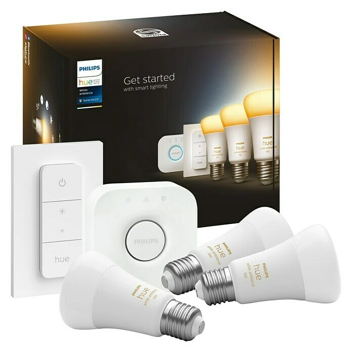 De Philips Hue starterkit White Ambiance E27 bevat drie slimme lampen, een Hue bridge en een dimmer switch. Zo heb je een complete set om de verlichting in huis naar wens te regelen en alle functies te gebruiken. Regel direct het licht in je hele huishouden, dim of fleur kamers op, schakel lampen aan en uit of activeer lichtscènes. Met de meegeleverde plakstrips bevestig je de draadloze Philips Hue-dimmer op batterijen overal. Gebruik meer dan 50.000 tinten van warm tot koel wit licht om je in de juiste stemming te brengen voor werk, spel of ontspanning – ongeacht het tijdstip van de dag. Begin de dag met koel en verkwikkend wit licht, of bereid je voor op de nacht met gouden tinten licht. Maak uw dagelijks leven gemakkelijker met vier vooraf ingestelde lichtscènes die speciaal zijn ontwikkeld voor dagelijks gebruik. Twee scènes met koelere tinten, Energize en Concentrate, stimuleren je ’s ochtends en zorgen voor focus, en de warmere scènes, Read en Relax, zijn ideaal om te genieten van een goed boek en innerlijke rust te vinden. Philips Hue werkt met Amazon Alexa, Apple HomeKit en Google Home via Google Assistant zodat je je lampen kunt bedienen met je stem.