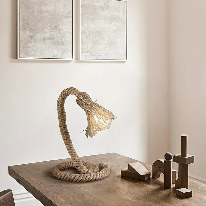 De Home Sweet Home tafellamp Pier is ideaal als eyecatcher op het nachtkastje, bijzettafeltje of dressoir. De lamp is optisch gebaseerd op een scheepstouw. De E27-fitting is kunstig verborgen in het uiteinde van het touw, zodat de gebruikte lichtbron door de eindvezels schijnt. De lichtbron kan vrij worden gekozen en druppelvormige lichtbronnen in combinatie met het gefranjerde uiteinde van het touw zorgen voor een bijzonder harmonieus uiterlijk.