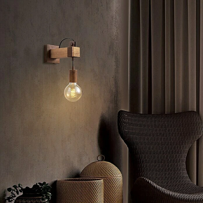 De Home Sweet Home wandlamp Denton overtuigt met het rustieke design van hout en metaal. De lamp kan worden gebruikt met alle E27 gloeilampen tot een maximum van 10 watt. De helderheid en de lichtkleur kunnen worden bepaald door de vrije keuze van de lichtbron. In combinatie met decoratieve gloeilampen wordt de lamp een bijzondere blikvanger.